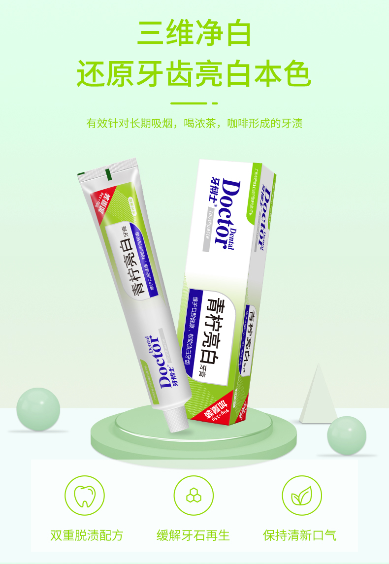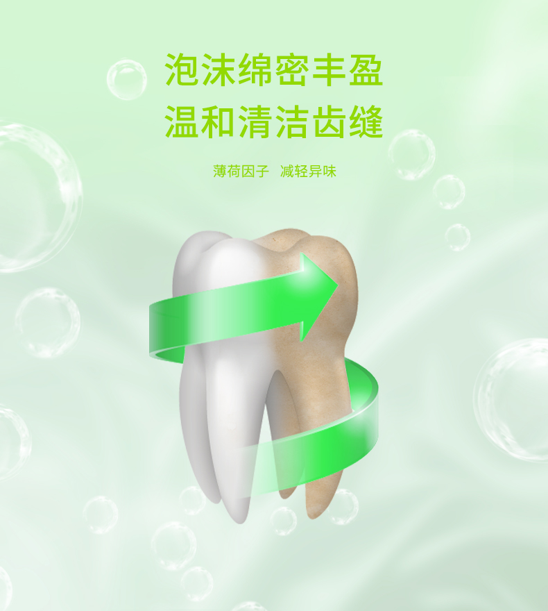 雙重潔齒微粒,減輕牙漬,維護(hù)牙齒和牙周組織健康,有效減少牙菌斑,調(diào)節(jié)口腔酸堿平衡,潔白牙齒,持久清新口氣。